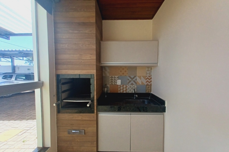 01 quarto c/armário, 01 suíte c/armário, sala, cozinha, banheiro, área serviço, área churrasqueira, garagem.